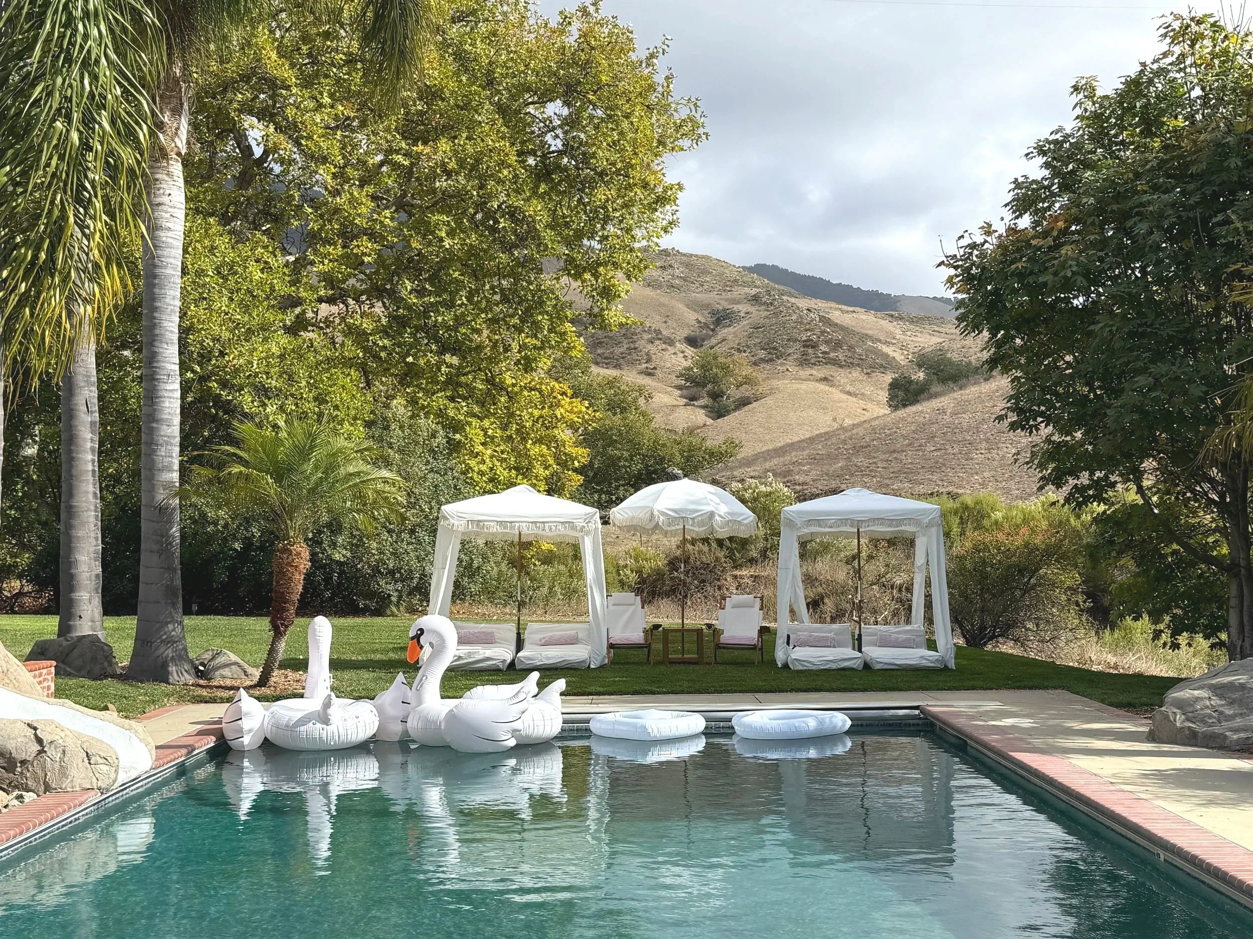 Boho Umbrellas and Cabanas with blankets or towels, chairs and mini tables. Perfect to add shaded seating to your pool party, bachelorette party or wedding. Loungers upgrade or themed pool float rental included in rental.